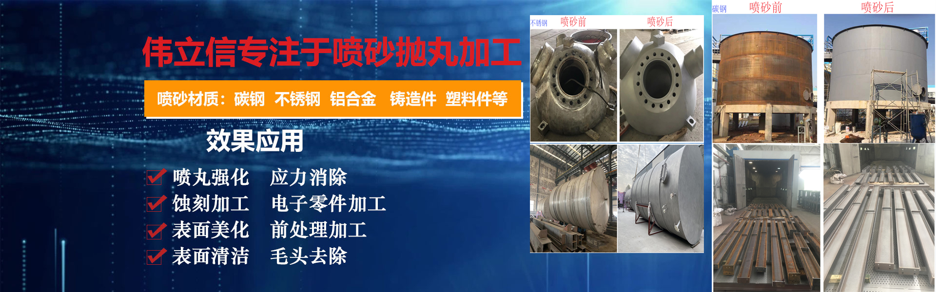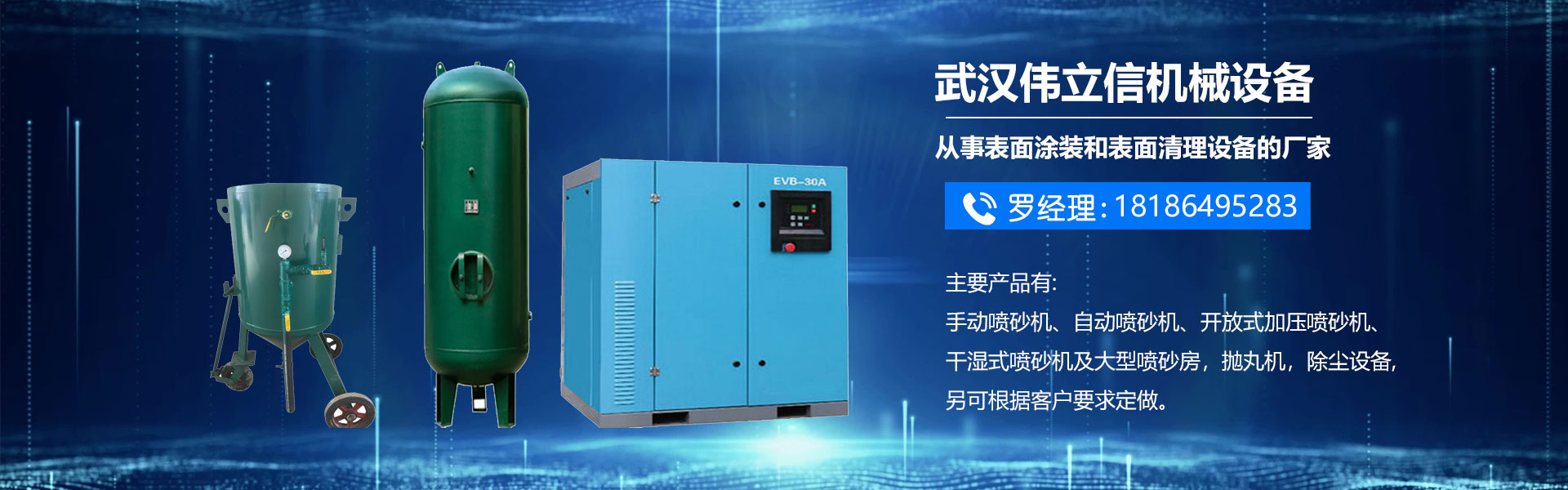 武漢偉立信機械設備有限公司(噴砂熱線:18186495283)是一家從事表面涂裝和表面清理設備的廠家,公司位于武漢市武昌區。是一家集表面涂裝和表面清理設備科研、開發、生產、銷售、服務于一體的綜合型企業。 公司自創建以來,一直秉持認真、負責的態度,以其科學而嚴密的管理,先進而不斷創新的技術,致力于表面處理設備的研制和開發,主要產品有:手動噴砂機、自動噴砂機、開放式加壓噴砂機、干濕式噴砂機及大型噴砂房,拋丸機,除塵設備,另可根據客戶要求定做。低價經營各類噴砂磨料:玻璃珠、鋼砂、鋼丸、不銹鋼丸、鋼絲切丸···